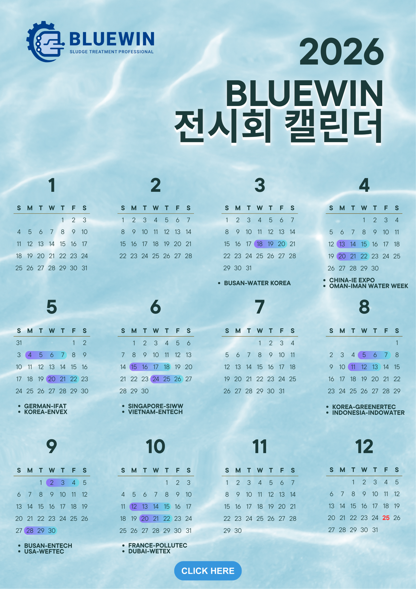 1986년에 설립된 BLUEWIN은 하수 및 정수 처리장에서 발생하는 슬러지를 위한 1차 탈수 장비를 전문으로 합니다. 현재 국내 시장 점유율 70%를 차지하고 있습니다.